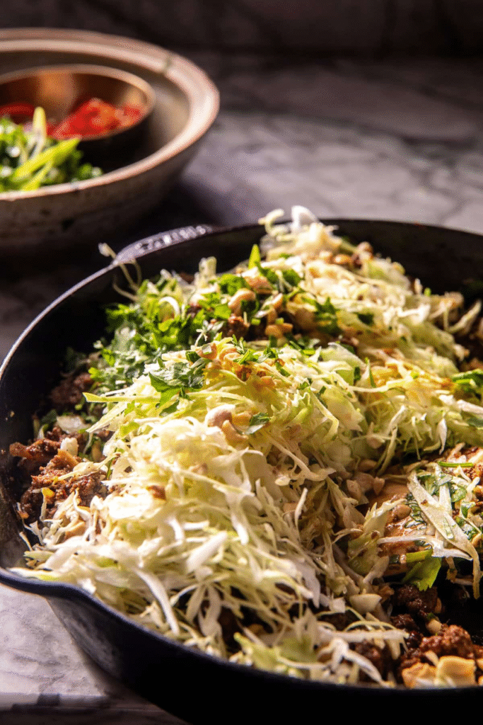 For the beef, I use ground beef, garlic, and pickled sushi-style ginger (I grab mine from Whole Foods). Cook it all together with chili sauce and roasted peanuts over medium-high heat. Feel free to swap in chicken or pork if you prefer.
